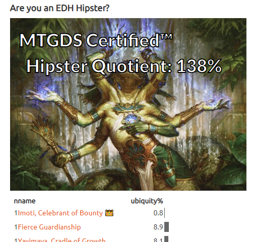 You can take a screenshot of the "Hero Image" of your commander's illustration superimposed with your "MTGDS Certified" Hipster Quotient, and present that to your opponents as verification of your deck's relative ubiquity or obscurity.