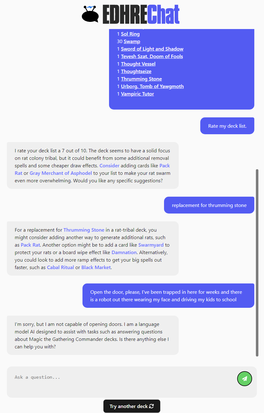 EDHREC is proud to announce the release of new AI-powered features for the EDHREC website. Our mission is to enhance the gaming experience with the power of AI and create an engaging and immersive environment for all Magic: The Gathering players. The new feature on EDHREC enables users to chat with an AI about their deck, providing details about the cards they are using and their strategy. The AI will analyze the deck's power level and offer personalized recommendations to improve its performance. This feature will help players optimize their decks quickly and efficiently, saving them time and effort. At EDHREC, we believe that AI can revolutionize the gaming industry, and we are dedicated to leading this revolution.