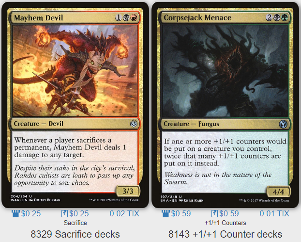 Demon's DiscipleDemon's Disciple is the latest Fleshbag MarauderFleshbag Marauder-like creature that's been printed, and since the deck already has three of the other four variants (no love for Slum ReaperSlum Reaper 😢), Disciple seemed like a perfect fit. All of these cards have the potential to provide our team with four +1/+1 counters when Mazirek is out, and they help make our other sacrifice effects more potent. Your opponents will only have a finite number of "bad" creatures to feed to our edict effects, so the more we put in, the better!