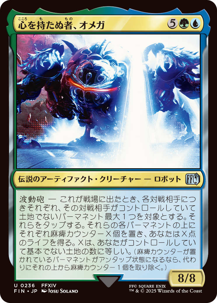 Of note, there was one card spoiled that still doesn't have an English render yet. That card is (tentatively) called Omega, the Heartless. That card's gameplay mechanics are not in question, although the name and any added flavor text are, at current. However, here is what that card does, along with its Japanese render: