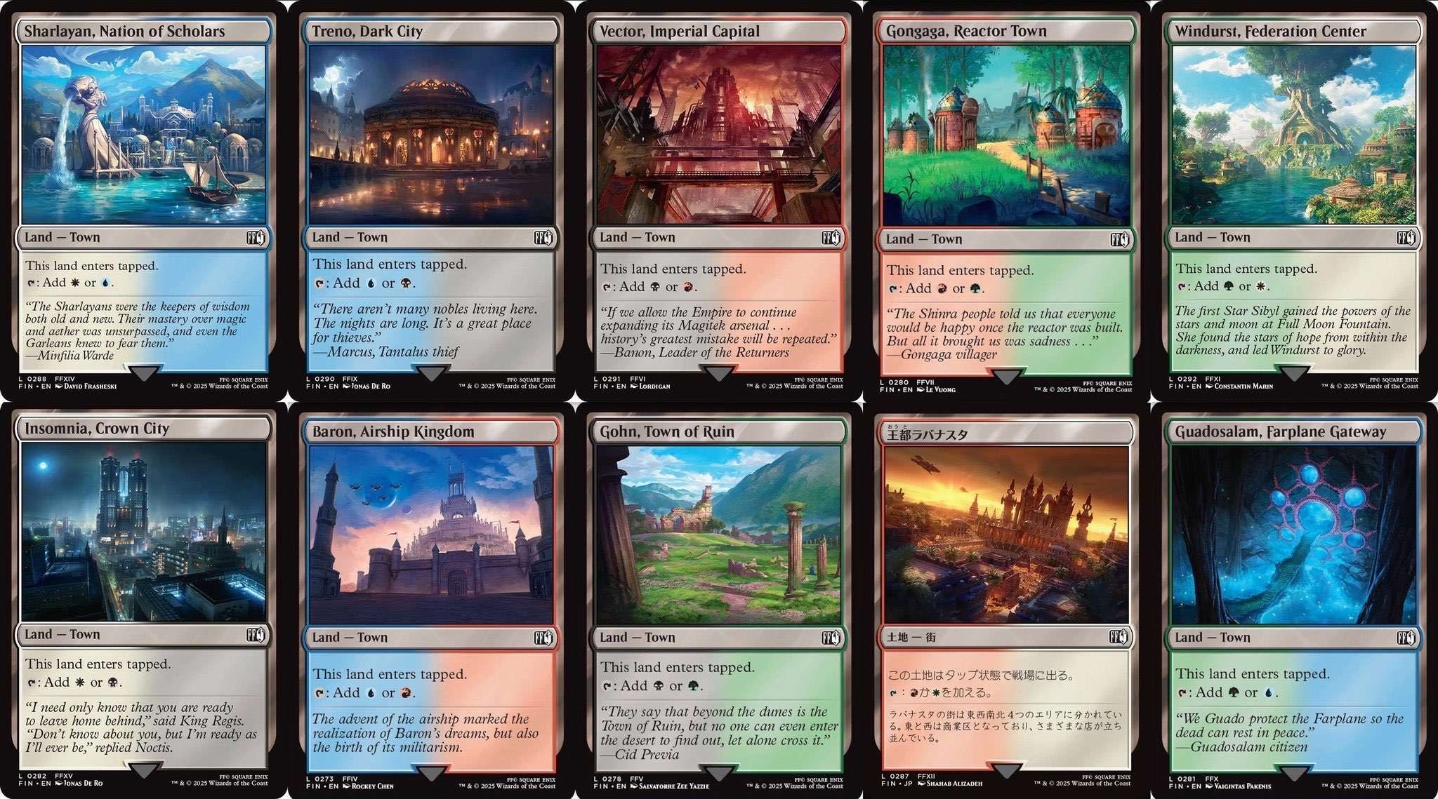 The cycle of ten Town dual lands from Final Fantasy. Previewed on Wednesday, May 21st. Image credit: Wizards of the Coast and Square Enix