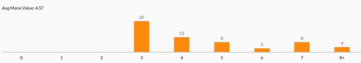 We also run quite a lot more of four- and five-mana cards (20 to 11, combined), given that they're basically the beginning of our curve and not in the middle, as per the average deck. On this note, I have to say that lowering the number of four-drops might be a future change in our list, as they compete with our commander as the card we want to cast first with that same mana value.