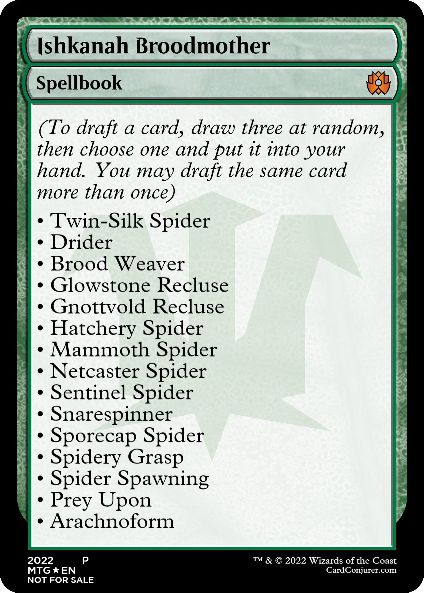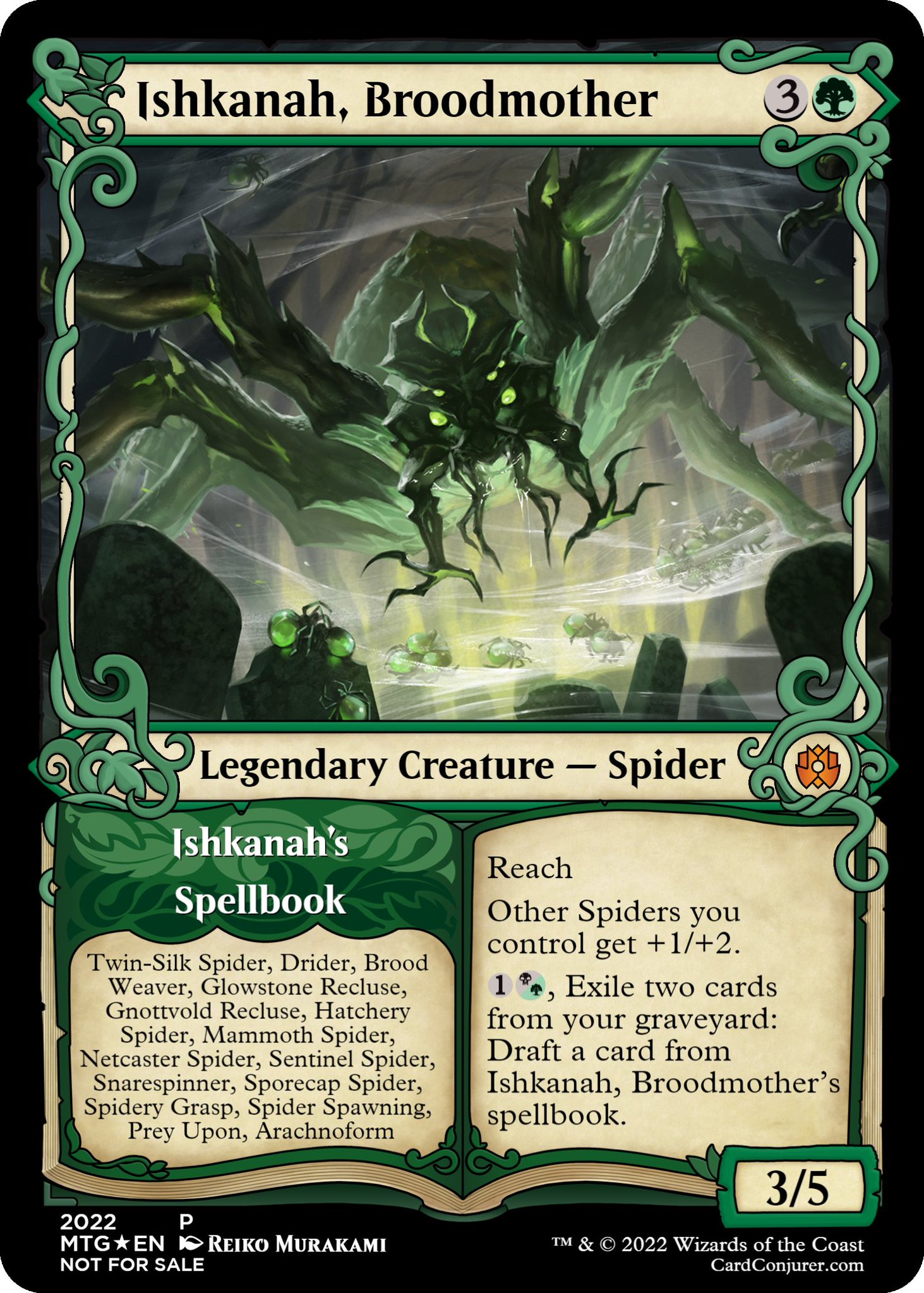 This is my Ishkanah, Broodmother deck. Again, stupendous alters from @imkyle on Twitter. You'll see the spellbook listed here as well. None of the spellbook cards are included in the deck itself. It would work just fine as an Ishkanah, Grafwidow deck, too, but I've chosen to lean heavily on creatures, so Delirium may not be turned on all the time. I wanted a heavy creature count to increase numbers for Spider SpawningSpider Spawning and to help me swarm the board with cards like Lurking PredatorsLurking Predators and Primal SurgePrimal Surge. The idea of these cards creating a Spider swarm is super flavorful for me and leans into a lot of synergies in the deck.