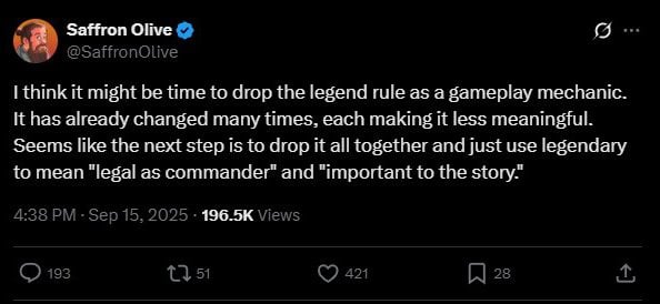And this is just the latest iteration of the rule as well. As hinted at by Saffron's tweet, the legend rule has gone through a few changes over its history. There was once a time where having a legendary creature enter play on your side of the board would force an opponent playing the same legend to sacrifice theirs, turning some of the best creatures in your deck into 2-for-1 kill spells in a mirror match.