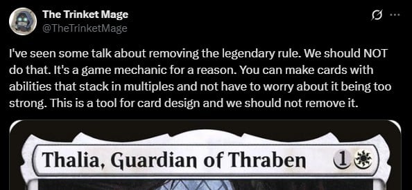 Now I can agree that the legend rule is already a little contentious. It's been through a lot of changes and it can lead to some confusing mechanical moments, especially for new players. But to outright remove it from the game would be a massive change.