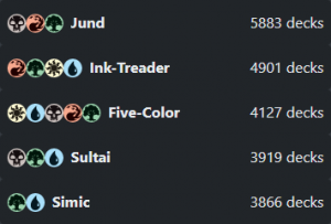 Like I said in my 2022 retrospective, the only reason blue is the second-best color here is because of all the cards played with the Simic color identity, like Growth SpiralGrowth Spiral. In fact, the only mono-blue cards in all the average decks put together are Roil ElementalRoil Elemental, Meloku the Clouded MirrorMeloku the Clouded Mirror, Retreat to CoralhelmRetreat to Coralhelm, and two Gate-related cards, Guild SummitGuild Summit and Way of the ThiefWay of the Thief. Still, blue being a part of Simic means that we should try and avoid it. I have to say, I'm really surprised white is the worst color here. In my mind, white is the second-best at land ramp besides green. Yes, it is often "catch-up" ramp, but it is ramp nonetheless. Then we have to choose: do we go Orzhov or Boros?
