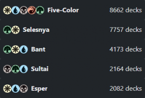 The five most popular Enchantress combinations are five-color with Go-Shintai of Life's OriginGo-Shintai of Life's Origin, Selesnya with Sythis, Harvest's HandSythis, Harvest's Hand, Bant with Tuvasa the SunlitTuvasa the Sunlit, Sultai with Tatsunari, Toad RiderTatsunari, Toad Rider, and Esper with Zur, Eternal SchemerZur, Eternal Schemer. I've compiled each commander's average deck, taken out the cards that don't relate to the archetype, like Generous GiftGenerous Gift or CounterspellCounterspell, and mashed them all together. We get this color spread: