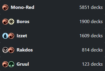 The top five commanders for these colors are Torbran, Thane of Red FellTorbran, Thane of Red Fell, Firesong and SunspeakerFiresong and Sunspeaker, Ghyrson Starn, KelermorphGhyrson Starn, Kelermorph, Tor Wauki the YoungerTor Wauki the Younger and Klothys, God of DestinyKlothys, God of Destiny. Let's take those five average decks, put together all the relevant cards, and see what color spread we get.
