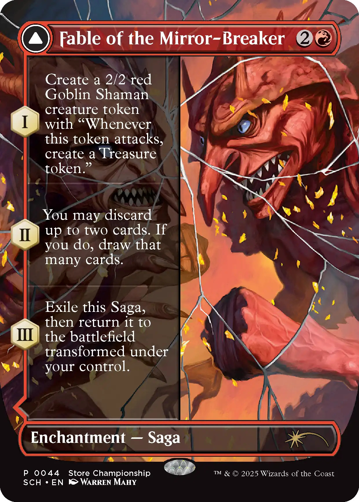 Next on the docket, there are three promotional cards for the Store Championship events at your participating local game store! Participants will receive a copy of Bitter TriumphBitter Triumph, the Top 8 players will receive a copy of Slickshot Show-OffSlickshot Show-Off, and the Store Champion themselves will receive a traditional foil, borderless copy of Fable of the Mirror-BreakerFable of the Mirror-Breaker!