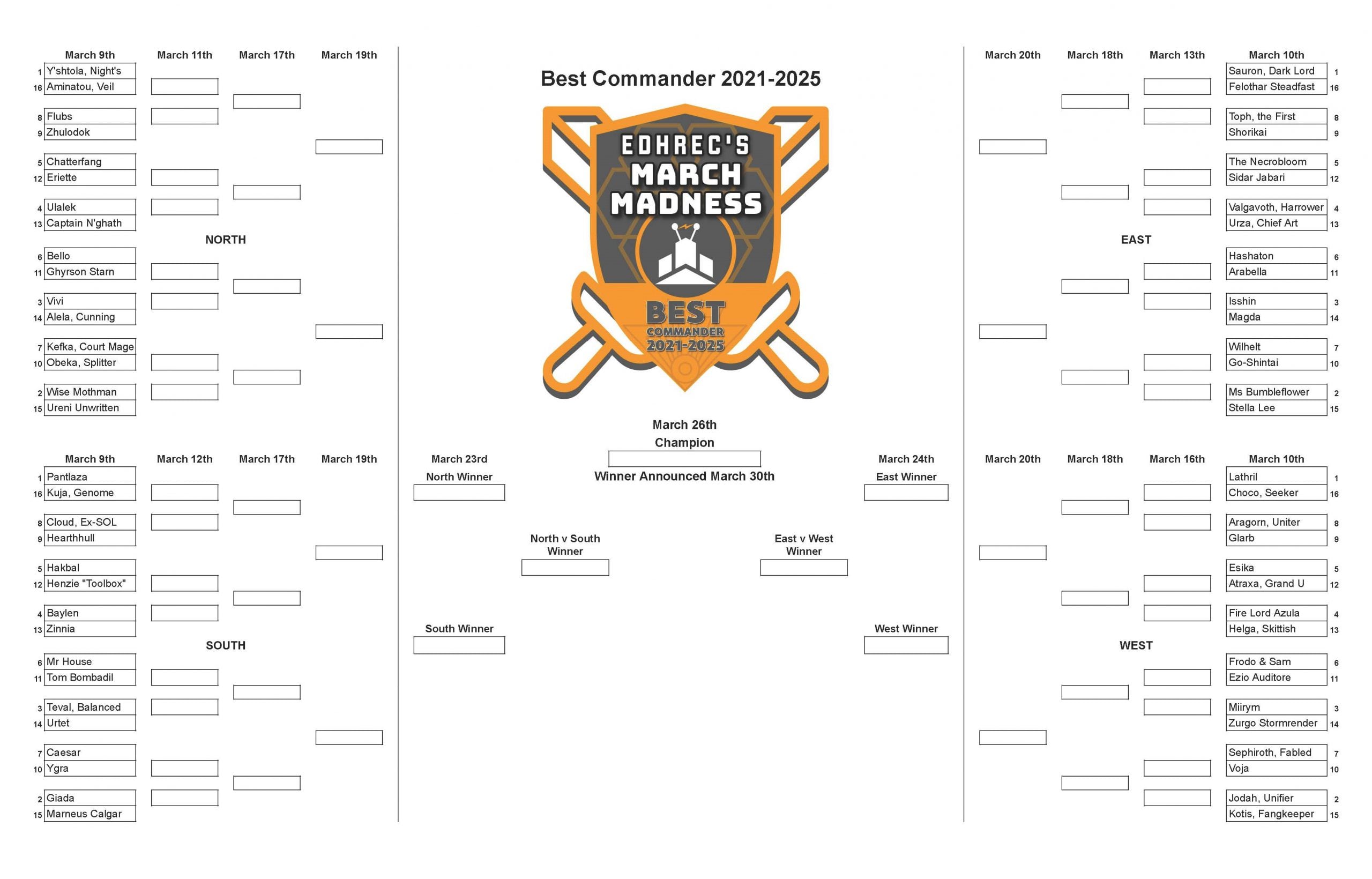Our March Madness tournament takes the 64 most popular new commanders from the years 2021 - 2025 and throws them in a bracket-style contest. The commanders have been seeded based on their number of decks.