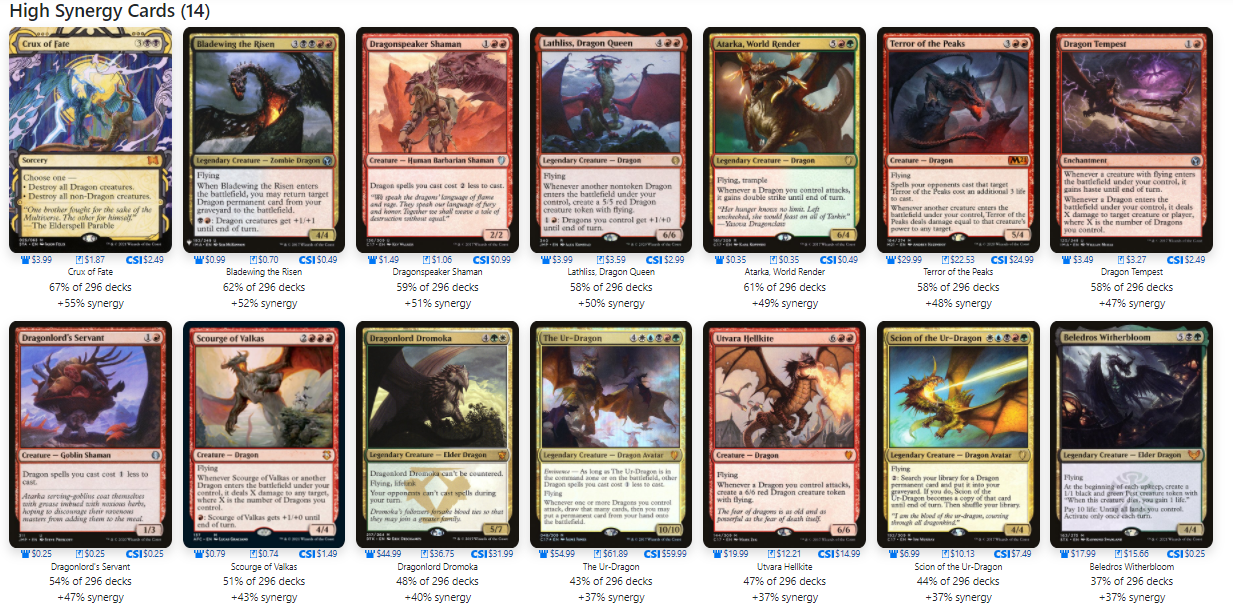 It's no surprise that Tiamat's high synergy list is filled with Dragons. None of the rest of the cards (both in the High Synergy and Top Cards sections) are particularly unexpected, all falling within the traditional mold of Dragon tribal or 'five-color goodstuff'.