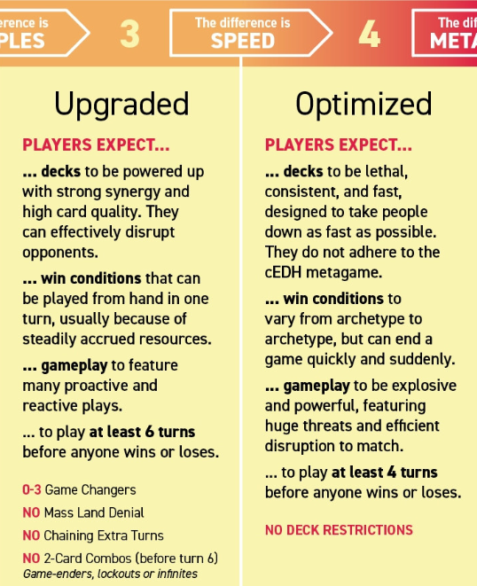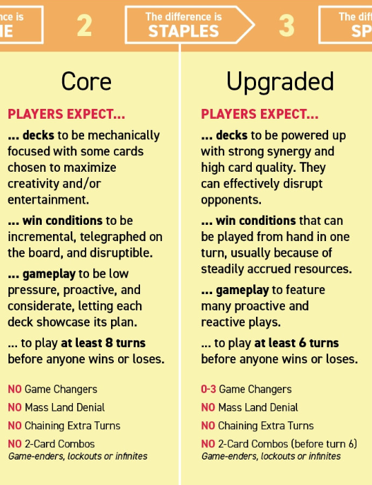 I support nearly all of this, with the exception of players expecting "decks to be unoptimized." While this might be true for some of the card choices, there are still plenty of "optimized" card choices that you should be able to put in your deck without pushing it to Upgraded. I mean, it's hard to get more optimized than Sol Ring, right?