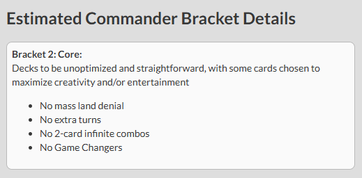 Between Brackets 2 and 3, instead of the difference being STAPLES, I think it should be GAME CHANGERS. To my mind, Core Bracket is where you get to play free from all the obnoxious and game-warping Game Changers.