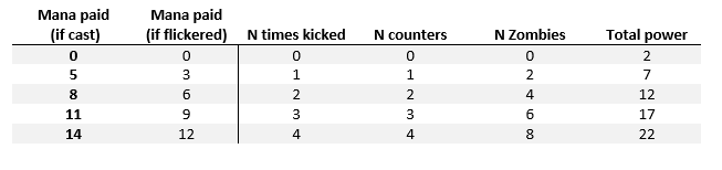 In fact, let's just break it down in a table. I'll put a column for the mana paid when cast (e.g., from hand) and another for mana paid when not cast and just for the enter the battlefield trigger (e.g., if flickered).