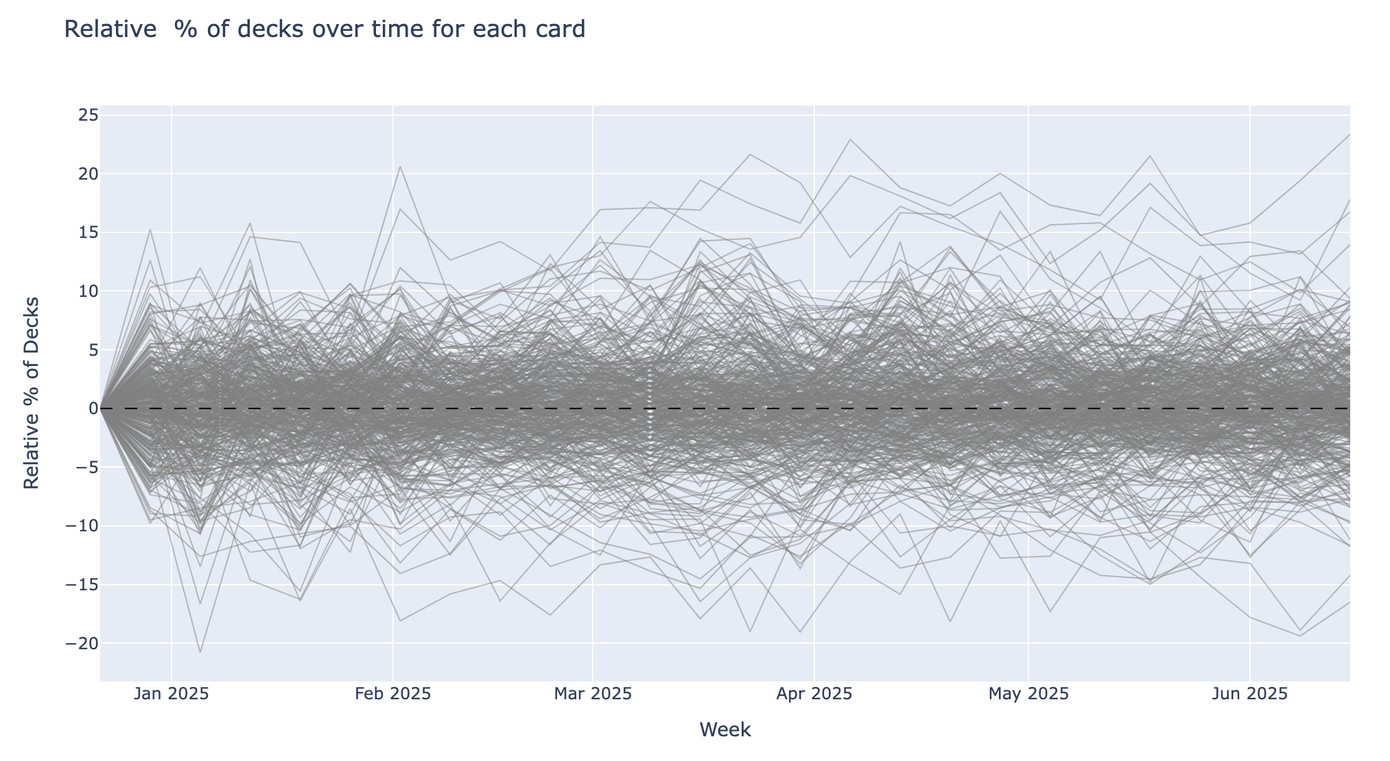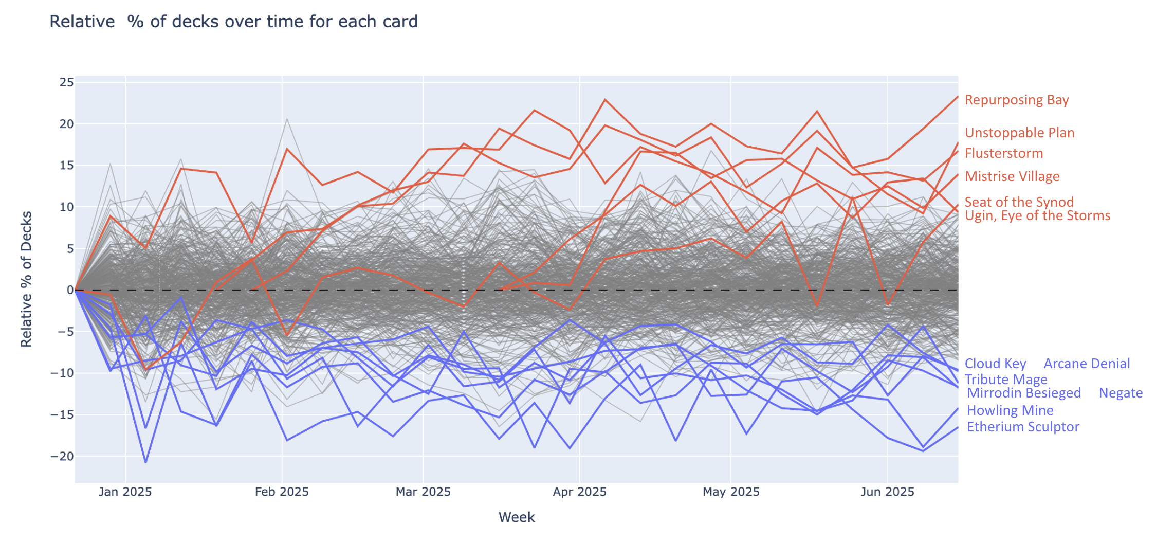 Let's once again plot the relative time series graph, this time highlighting the identified fiery and icy cards.