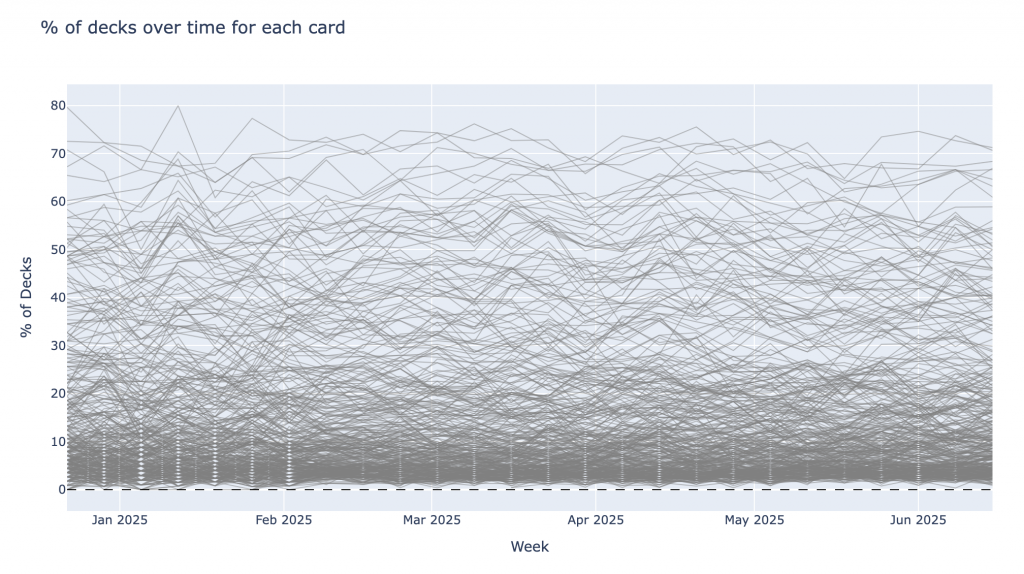 This plot shows a time series of the weekly usage of all 378 qualifying cards across this commander's decks.