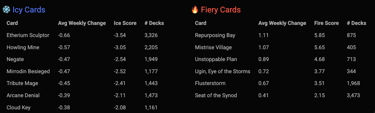 Repurposing BayRepurposing Bay takes the cake for fieriest card, with a Fire score of 5.85, and Etherium SculptorEtherium Sculptor as the iciest card, with an Ice score of -3.54.