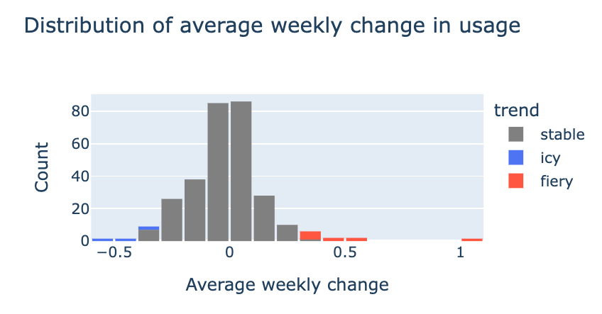 If we calculate the average weekly change for each card and look at the distribution across all qualifying Urza cards, we see roughly a bell curve with some extreme values that get flagged as being fiery or icy: