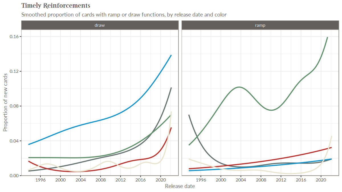 For each set of cards making their debut, we can just count the number of cards that serve a ramp and/or card draw function, then divide by the total number of new cards. When you do this, and plot the smoothed trend of the proportion over time, it looks like this: