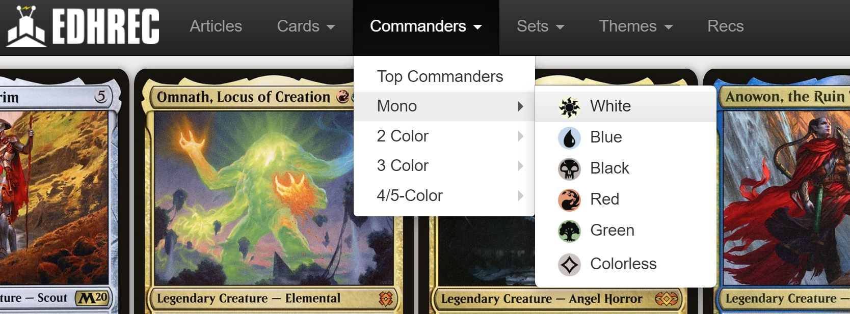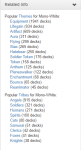 At the top of the page, click "commanders" and select "mono" and "white" from the next part of the drop-down. It will bring up a list of the top mono-white commanders along with a list of "related info", which is what we're interested in.