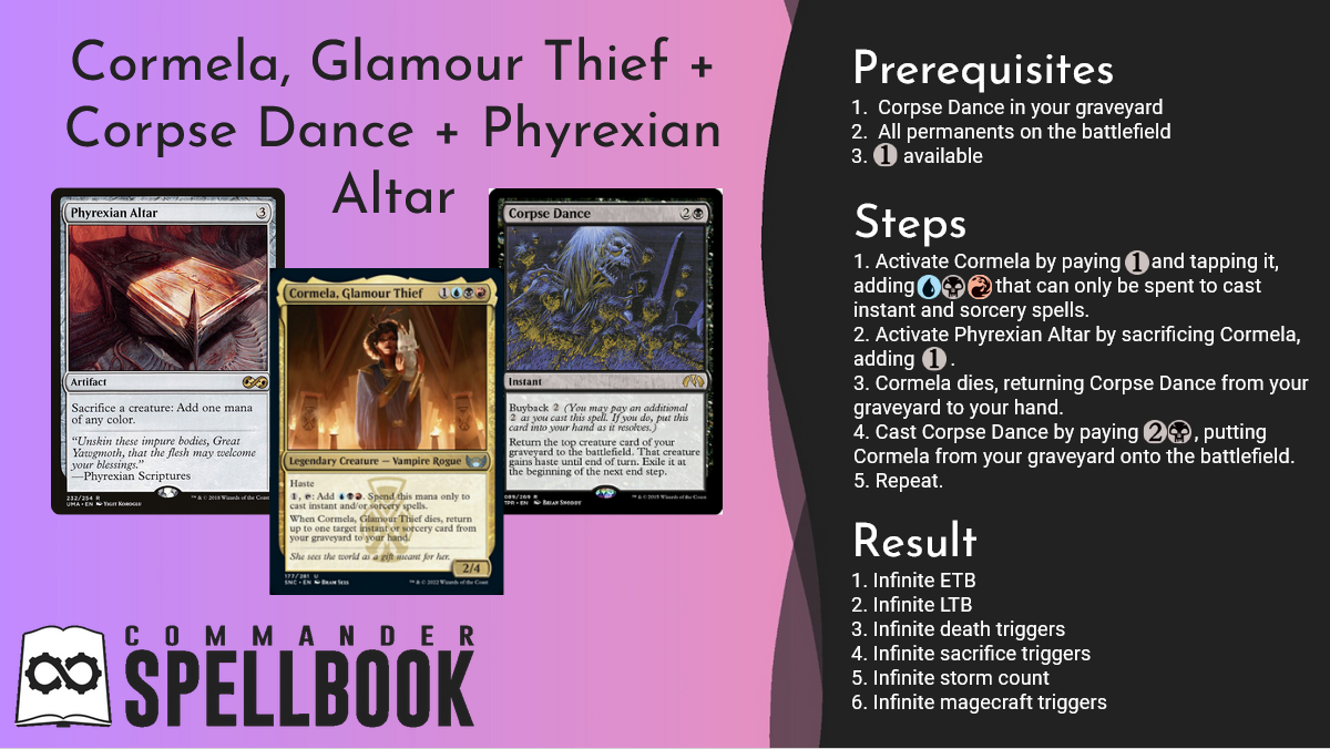 Time to start our hunt again. When looking at Cormela, Glamour ThiefCormela, Glamour Thief, the second ability seems like something that can definitely feed a combo, but not necessarily make a good base for our combo. Rather, I think the key lies in our last ability. Cormela, Glamour ThiefCormela, Glamour Thief can grab us spells from our graveyard. Unlike Kess, Dissident MageKess, Dissident Mage, when we cast the spell, it goes right back into our graveyard. There's one last issue, though: Cormela, Glamour ThiefCormela, Glamour Thief is a creature card. That means that when she dies, she's either going to go to our command zone or sit in the graveyard and question why we've abandoned our commander. The first option doesn't seem great, costing 2 more whenever we want to cast her, but the second option we can definitely work with. We can quickly pull her out of our graveyard to get rid of the guilt using the power of reanimation! Inject a bit of battlefield into that creature in the graveyard, and it's on the battlefield! Spells like Corpse DanceCorpse Dance, Footsteps of the GoryoFootsteps of the Goryo, or Demonic GiftsDemonic Gifts can quickly yoink our commander back onto the field, making it as though we never decided to put our commander in the graveyard.