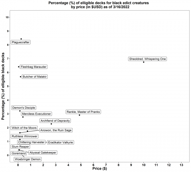 Unsurprisingly, Sheoldred, Whispering OneSheoldred, Whispering One leads the charge price-wise, but sees less play than PlaguecrafterPlaguecrafter and barely sees more play than Fleshbag MarauderFleshbag Marauder. In fact, outside of SheoldredSheoldred, Rankle, Master of PranksRankle, Master of Pranks, and Archfiend of DepravityArchfiend of Depravity, practically all of these cards are less than $1!