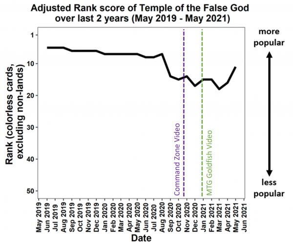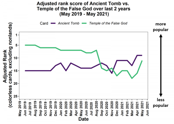 While the trends are virtually the same between the graphs, there are some subtle differences, especially around July 2020, where it appears Temple of the False GodTemple of the False God declined slightly in rank with a specific increase in nonland colorless cards. When those cards are removed, the decline between July and August seems a little more severe in the adjusted rank score. Overall, though, the trend is generally the same between the two, with Temple of the False GodTemple of the False God experiencing a slight decline in the last two years.