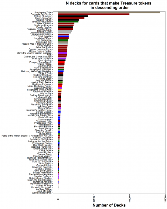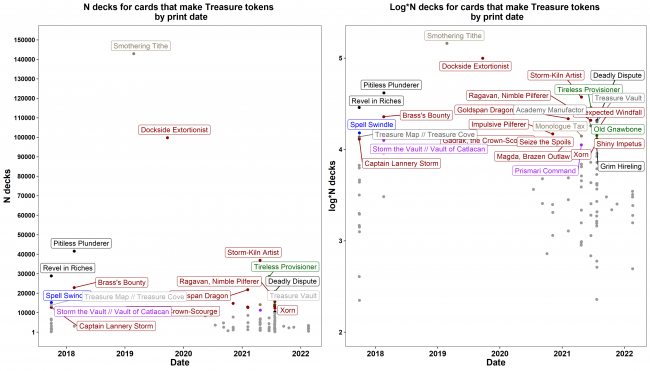 - Plot 1: The number of decks that any card that produces Treasure tokens can be found in, by print date.