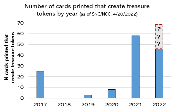 While we see a sizeable influx of Treasure-making cards in 2017, given their introduction in Ixalan and Rivals of Ixalan, that hiatus in 2018 is noteworthy, and there were only three cards released in 2019 that make Treasures. This may make things seem not all that bad, but don't be fooled so easily: two of the three cards that were printed in 2019 were Smothering TitheSmothering Tithe and Dockside ExtortionistDockside Extortionist, arguably the biggest offenders since the mechanic's introduction. Since then, we've see a huge swing upwards, with a veritable explosion of Treasure cards in 2021 and 2022.