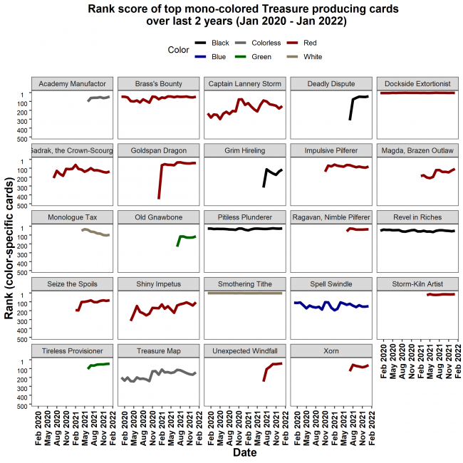 Rank score of top mono-colored treasure producing cards over last 2 years (Jan 2020 - Jan 2022)