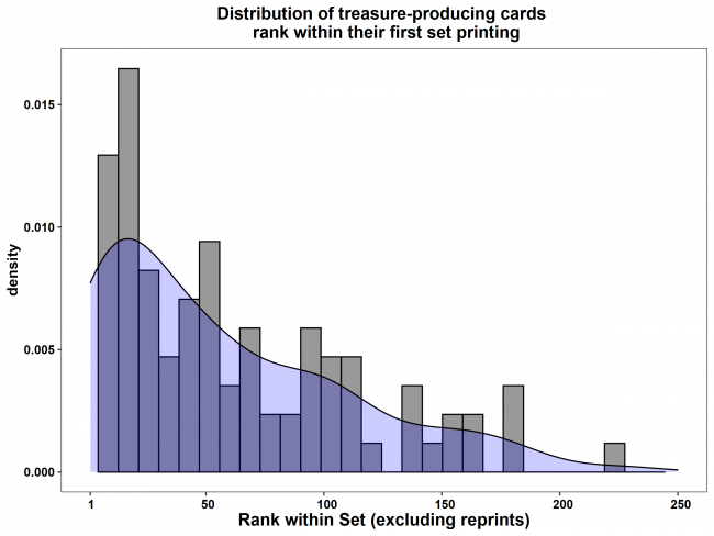What we see here is a histogram (gray) with an overlaid density plot (blue), and, given the skew, it certainly seems Treasure cards rank high within their sets. Some are big offenders, like Smothering TitheSmothering Tithe and Dockside ExtortionistDockside Extortionist (both rank 1 in their respective sets), but so are Deadly AllureDeadly Allure and Grim HirelingGrim Hireling. From this, I think it's safe to say, for now, that any given card that makes Treasure tokens is sure to be popular within the set it's released in.