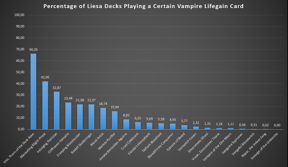 This commander isn't usually built as a Vampire general, as only 57 of the registered decks are actually labelled as such. So, let's see how popular Vampire lifegain-matters cards are in such an environment.