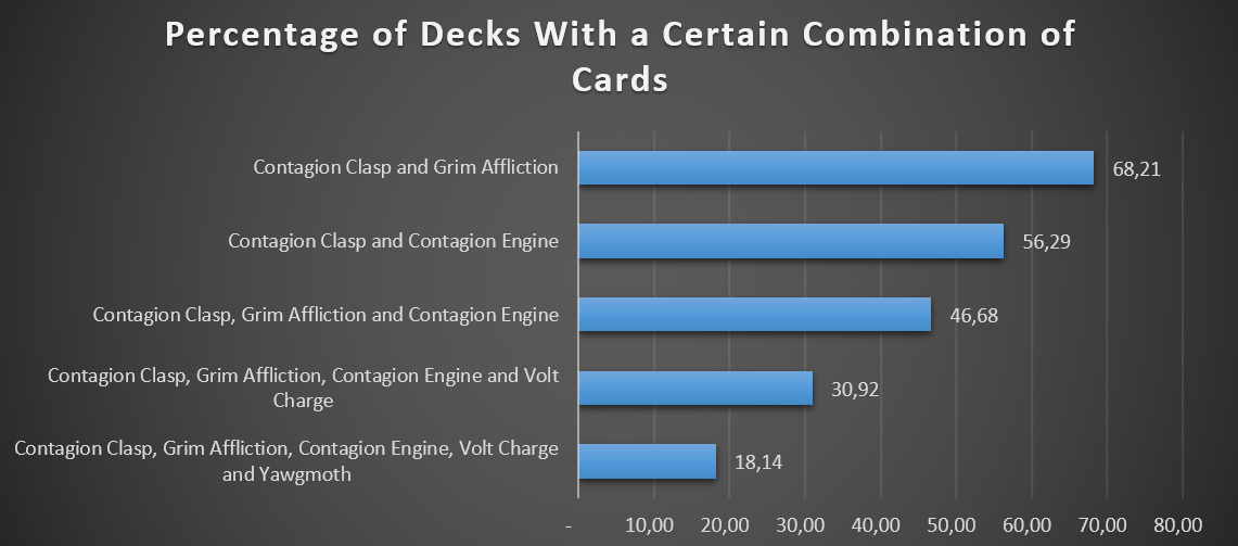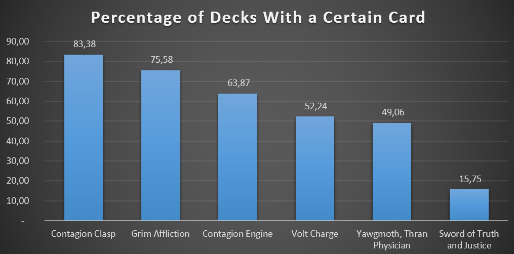 In fact, I decided to look at how many of these lists play more than one of these pieces. Once again, the graph is pretty clear. Around 47% of them want three Proliferating engines, and 31% of them decide to play even the fourth one in Volt ChargeVolt Charge. Only with the fifth, Yawgmoth, Thran PhysicianYawgmoth, Thran Physician, the numbers decline. All in all, this data tells us about players' dedication to including cards with Proliferate in their decks.