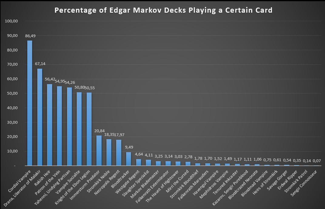 Lastly, we have the tail of the graph, the cards hovering around 2% of inclusion rate and lower. They are included because of their positive synergy with our gameplan, but they are also the ones more at risk of being swapped out with more Vampires being printed in every set. In fact, among them we find all the creatures that need to hit our opponents to start growing, such as Bloodcrazed NeonateBloodcrazed Neonate, Bloodmad VampireBloodmad Vampire, and Heirs of StromkirkHeirs of Stromkirk. While this is the founding idea of our deck, it's also a strategy that may be difficult to carry out in a format full of early blockers.
