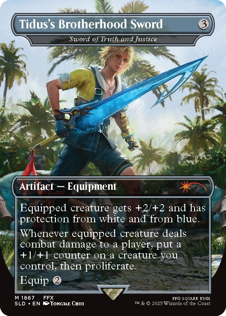 Tidus's Brotherhood Sword, a reskin of Sword of Truth and Justice from the Weapons drop from Secret Lair x Final Fantasy. Image credit: Wizards of the Coast and Square Enix