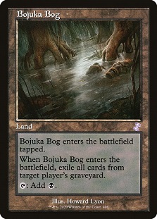 I live by the mantra "slow down and smell the taplands", and as such I've always been a huge fan of Bojuka BogBojuka Bog. Are there other options that can come in untapped and get rid of graveyards at instant speed? Sure. Have you been in any number of games where the player playing the Bog essentially flips a coin to see which two non-relevant cards they exile? Absolutely. But none of that changes the fact that Bojuka BogBojuka Bog makes mana and can absolutely save your bacon against the local MerenMeren or MuldrothaMuldrotha deck. I've never been a fan of the "auto-include" term, and I think it leads to a lot of people making poor deck-building decisions like we previously discussed with Eternal WitnessEternal Witness. But let me put it this way: I currently have seven different EDH decks which play black. Of those, five of them play Bojuka BogBojuka Bog. It's a solid effect that a lot of decks want, and the cost of inclusion is as low as it gets.