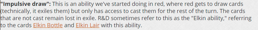 While not technically an impulsive draw card, I feel like I'd be doing a disservice if I didn't mention this other type of less-impulsive draw that we're started to see crop up every once in a while. "Exile a card, you may play that card as long as you control this card" is a slight improvement over the existing ability, and something I'd definitely like to see explored more. That, and I just love LukkaLukka, so y'all gotta suffer through me mentioning him at every opportunity.