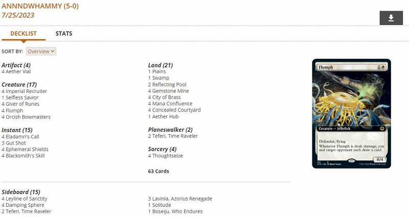 For those that haven't yet seen this delightful pairing, it works by putting FlumphFlumph into play, then throwing out Orcish BowmastersOrcish Bowmasters, targeting FlumphFlumph. This triggers FlumphFlumph to have you and an opponent draw a card, which then triggers Orcish BowmastersOrcish Bowmasters. Normally you'd only be able to repeat this four times, but the deck solves that issue by playing nine different sources of giving FlumphFlumph indestructible. This means you can keep the loop going until you or an opponent both draw your deck (which hopefully ends up being your opponent, given that you're playing 63 cards in your deck).