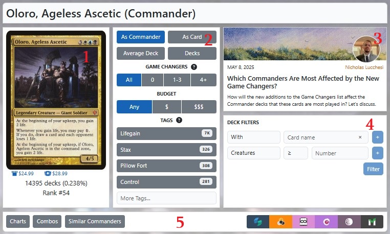 • Box 1 features the card image with the commander's deck count and rank compared to every other commander in the database.